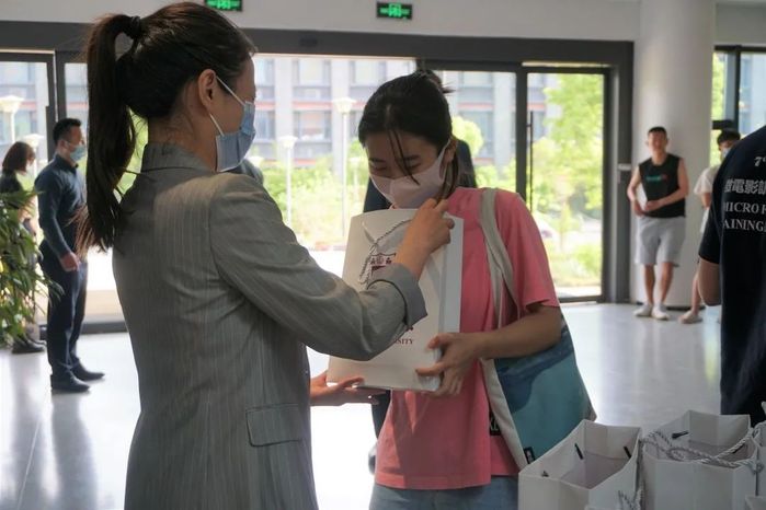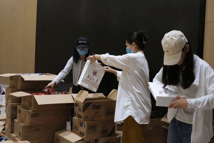 在指导老师和同学的共同合作之下,抗疫物资整齐地排列在紫金楼大厅的展台上,等待着新传同学的到来。四四方方的礼品袋,印着我们熟悉的南大校徽,装满了精心挑选的抗疫物资,承载着公司对同学们真挚的关心和祝愿。