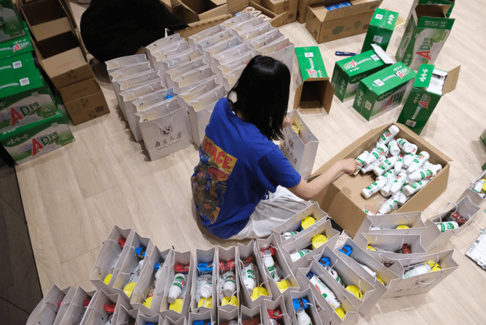 活动开始前期,新传团学联的志愿者们在公司现场根据标配分装礼包。抗疫物资有序地摆放成多列,志愿者们以流水线的方式高效而细致地完成物资分装。