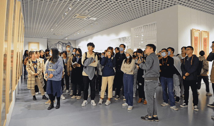 展览现场,同学们看见多件展品字体弯曲如同蚯蚓,具有直中寓曲、曲中有直之意。车旭东老师解释,这种笔法叫做“颤笔”,亦可称为“抖笔”。这是李瑞清对碑学的一种理解,此种顿错的笔法源于金文,有着从金石到碑学一条脉络。颤笔的顿挫之势增加了线条的质感和力度,体现书法的时代感和厚重感。在车老师生动形象的精彩讲述中,同学们不仅感受到作品本身的魅力,更感受到创作者的人文情怀与风貌。