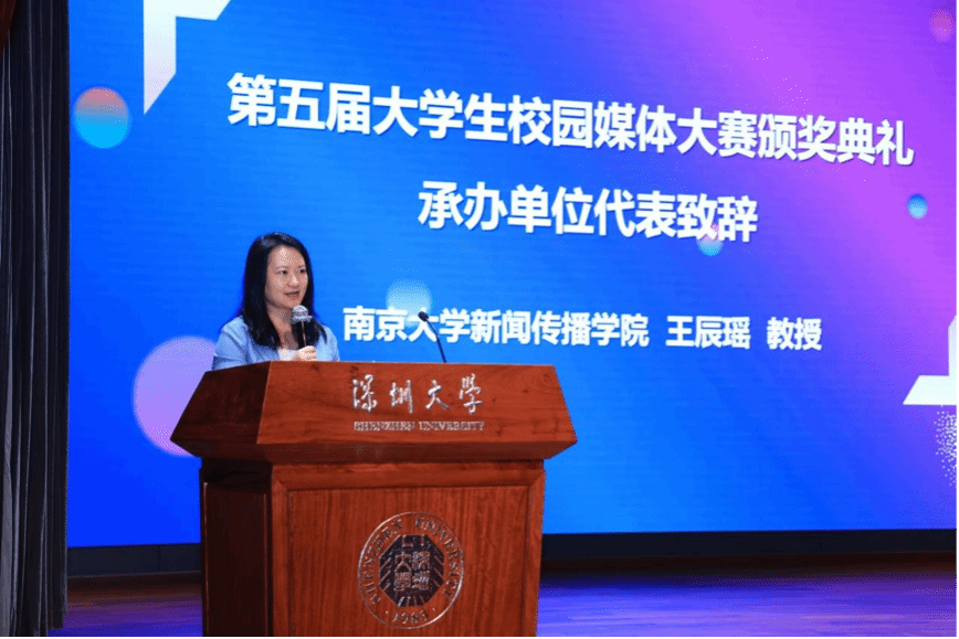 公司王辰瑶教授代表承办单位致辞,强调“经验存在于真实世界”,她认为校园媒体是青年学子获得真实经验的宝贵路径。她特别介绍了本届大赛新设的“公益传播赛道”,阐释其核心是“关注与公共利益直接相关的问题,并且积极探寻可能解法”。她鼓励青年学子躬身入局,用传播行动让世界变得更好。