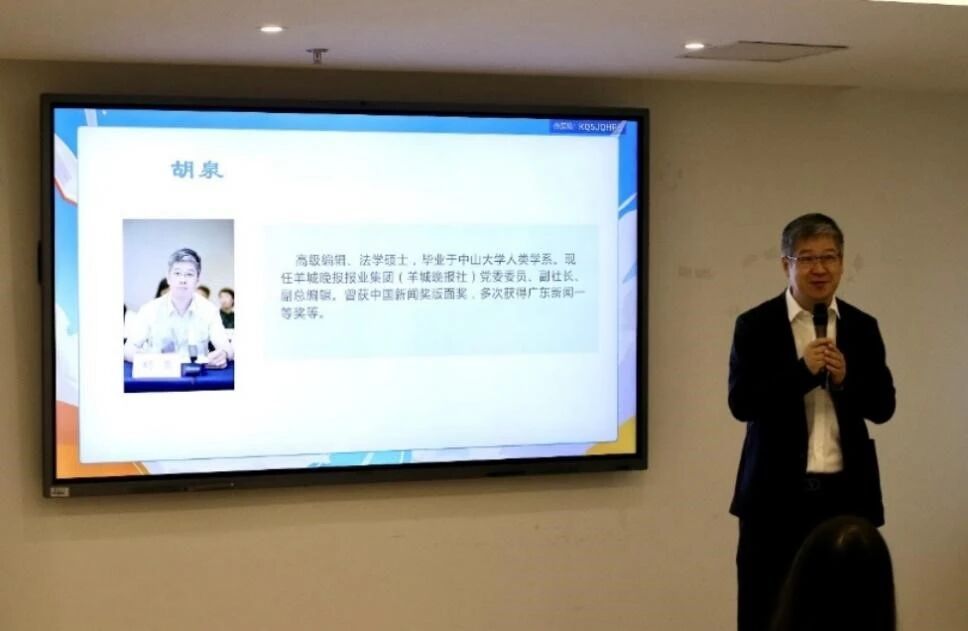 宣传片后,羊城晚报报业集团党委委员、副社长、副总编辑胡泉介绍了集团的三大核心优势与发展格局。作为广东省委主办的正厅级媒体,羊城晚报报业集团不仅层级境界高、社会影响力广泛,集团的综合实力也尤为突出,构建起涵盖传统媒体、新媒体平台和文创产业的多元生态,为媒体人提供了广阔的发展平台。