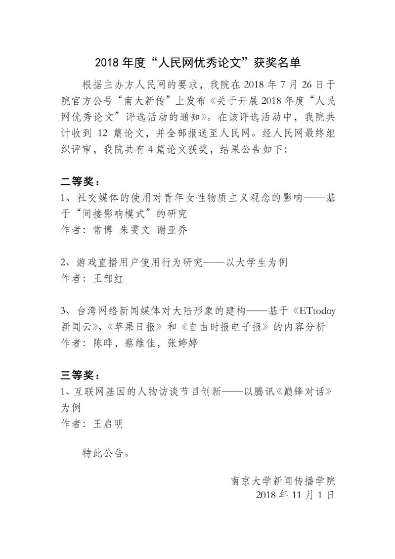 2018年度“人民网优秀论文”获奖名单