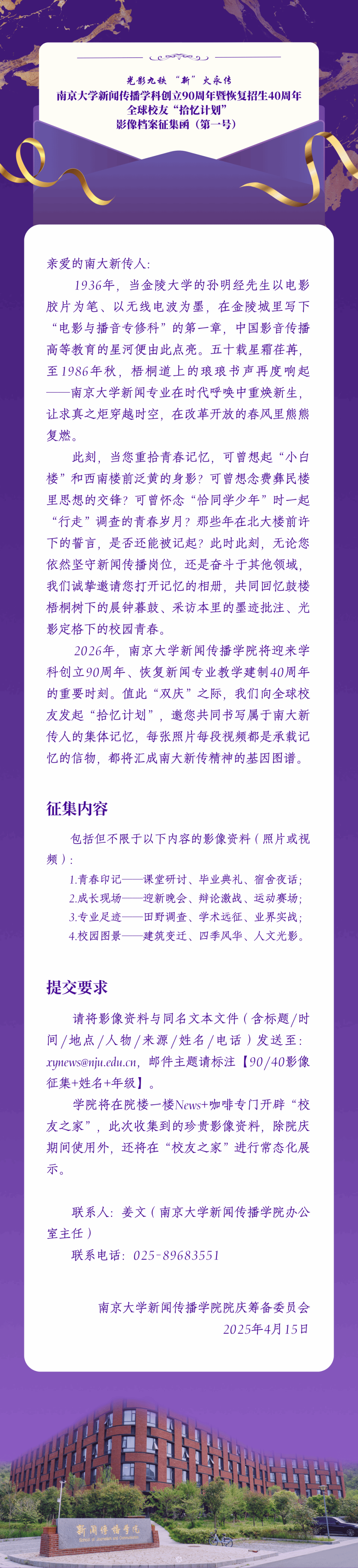 光影九秩,“新”火永传丨XC体育新闻传播学科创立90周年暨恢复招生40周年全球员工“拾忆计划”影像档案征集函(第一号)