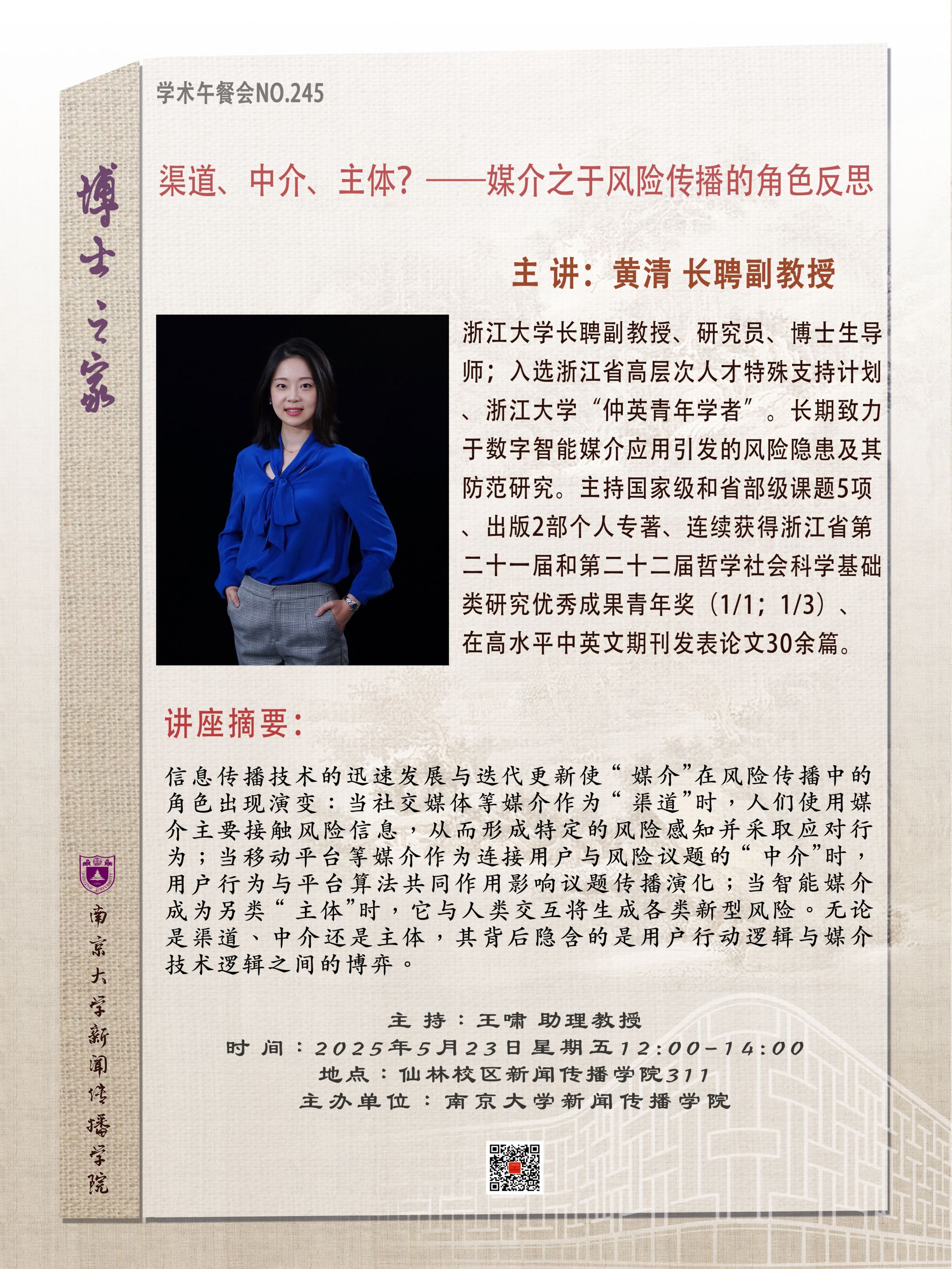 黄清,浙江大学长聘副教授、研究员、博士生导师;入选浙江省高层次人才特殊支持计划、浙江大学“仲英青年学者”。长期致力于数字智能媒介应用引发的风险隐患及其防范研究。主持国家级和省部级课题5项、出版2部个人专著、连续获得浙江省第二十一届和第二十二届哲学社会科学基础类研究优秀成果青年奖(1/1;1/3)、在高水平中英文期刊发表论文30余篇。