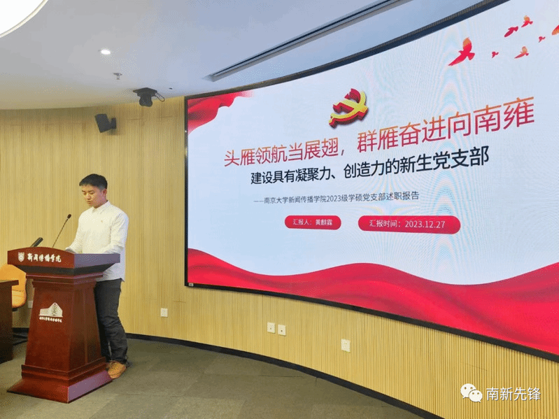 2023级学硕党支部书记黄麒霖重点介绍了支部成立三个月以来开展的各项活动,详细展示了支部支委进行材料梳理审查、联络其他公司其他年级党支部开展共建活动等方面进行的个性化工作,并表示支部未来将从党员本硕衔接、支部经验交流等方面着手开展更多细致创新的活动。
