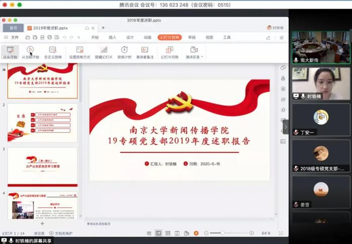 2019级专硕党支部书记时轶楠从党员学习教育、制度执行、班子建设及作用发挥四个方面对支部主要工作进行汇报,支部在理论学习、实地参观、创新党建项目方面重点推进。