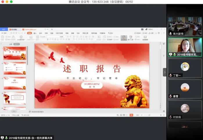 2018级专硕支部书记张一哲从支部基本情况、主题教育学习、问题查摆与整改情况、支部建设分析与总结展开述职。疫情期间,支部响应号召,第一时间向支部党员传达疫情防控知识,强调服务群众意识,自觉发挥先锋模范带头作用。