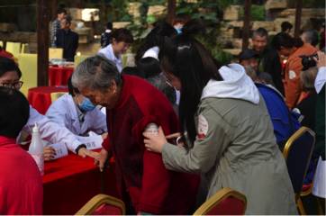 当天活动中,给入场人员贴活动臂章、向每一位老人赠送节日礼物、为老人泡菊花茶、协助省人医做义诊工作……同学们在不同的岗位上,用真心服务老人。“和想象中的完全不一样!今天看到的每一位老年人都是精神抖擞的,即使是年过八旬需要搀扶着走路的爷爷奶奶精神状态都非常好。”负责现场指引工作的张蕾同学这样说到。