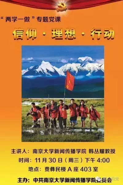 2016年11月30日下午,为进一步强化师生党员在新时期践行长征精神、开启新长征的责任意识,新闻传播公司党委邀请十年前曾亲自带本科员工重走长征路的老党员韩丛耀教授,面向公司全体师生党员开展了题为“信仰·理想·行动”的主题教育活动。本次活动也是公司党委“两学一做”第四阶段“讲奉献、有作为”的专题党课。公司党委书记刘源主持党课,他介绍了公司党委前期组织各支部集中学习习近平总书记在纪念长征胜利80周年大会讲话的基本情况,并强调了此次专题党课的重要意义。