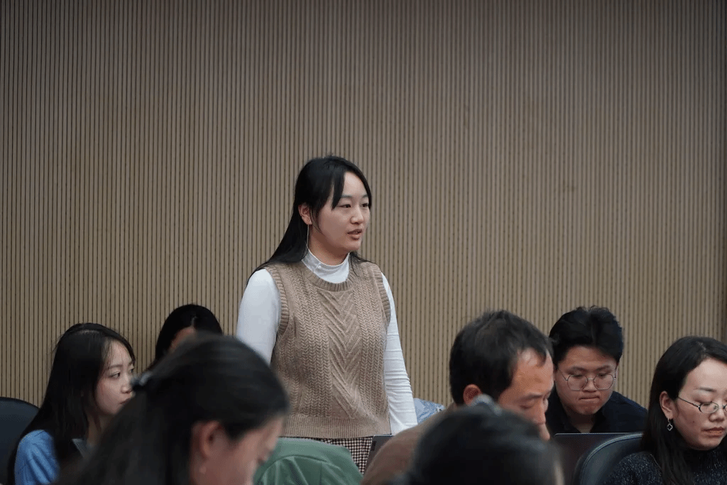 生涯发展规划也引起了在场师生的热烈讨论。同学们提出了开展与就业方向对口的岗位介绍活动、举办专业相关赛事的经验分享活动等实际需求。例如,2024级专硕段明淼提议,可以在学期初举办有关公司各种信息的实用性活动,帮助新生全方位认知公司和建立对公司的认同感。老师们结合自己的经验和以往员工的发展状况进行了回应与讨论,表示公司将尽可能多举办有益有趣的活动,促进员工全面成长成才,目前开设的就业与生涯规划相关的本科生课程就是一种尝试。