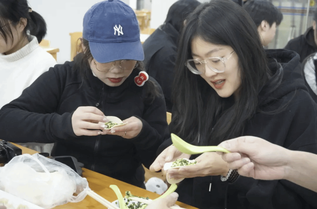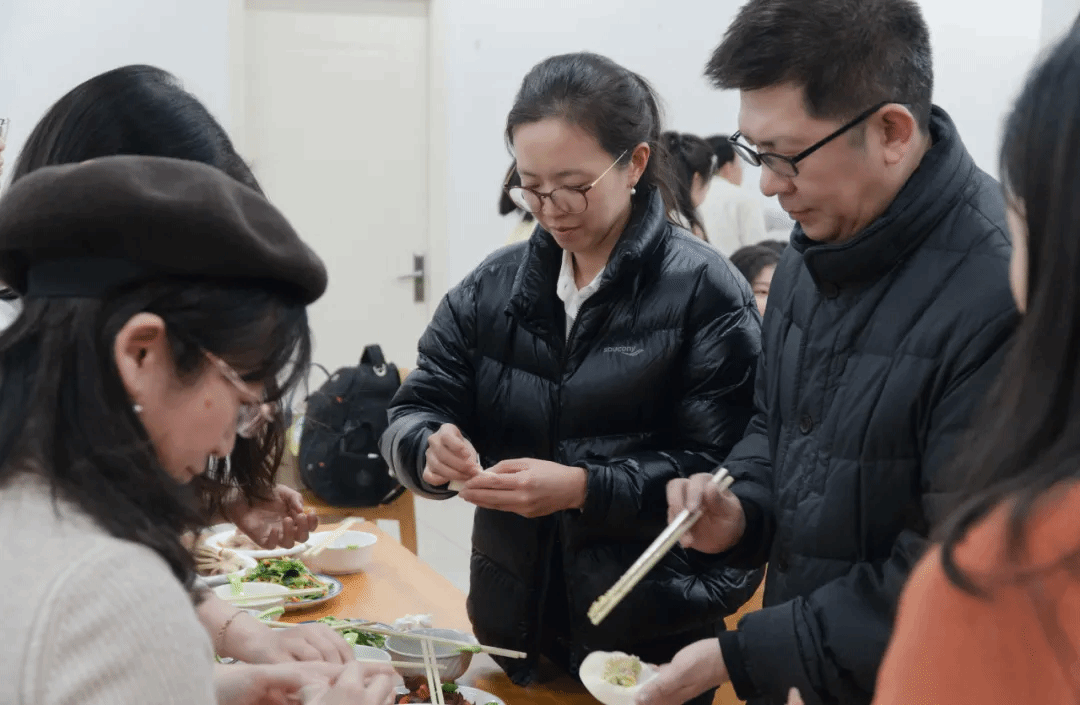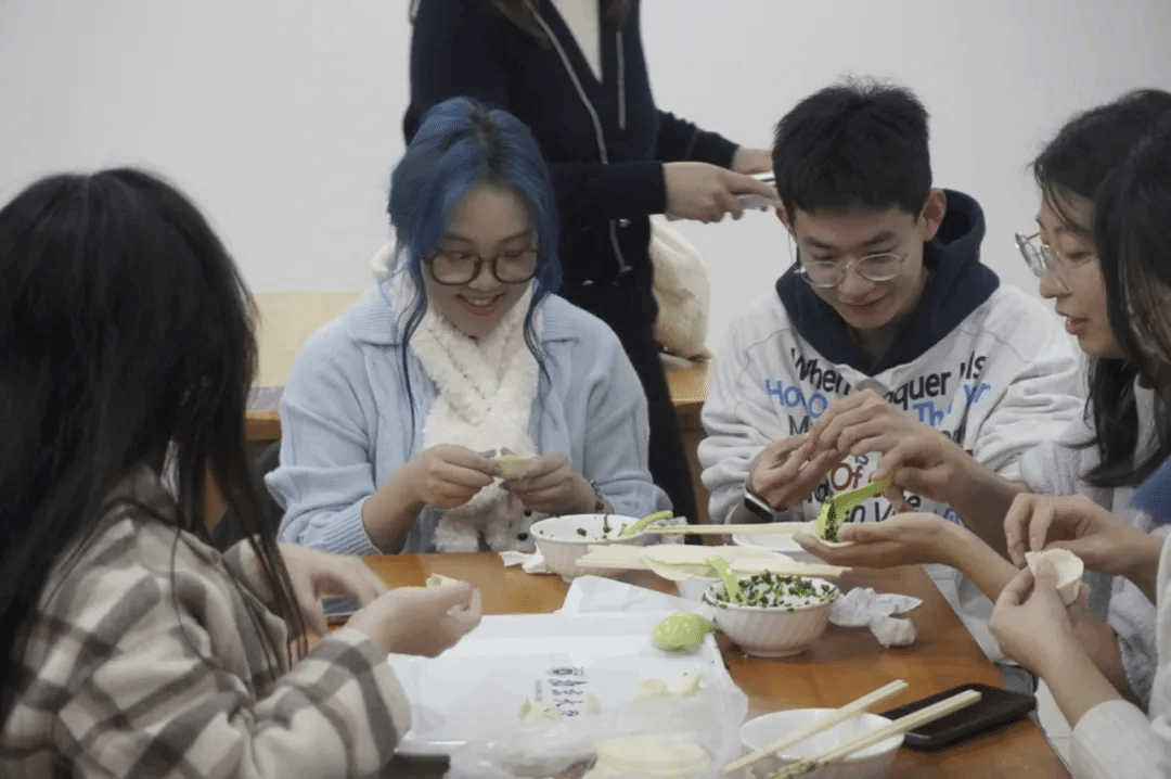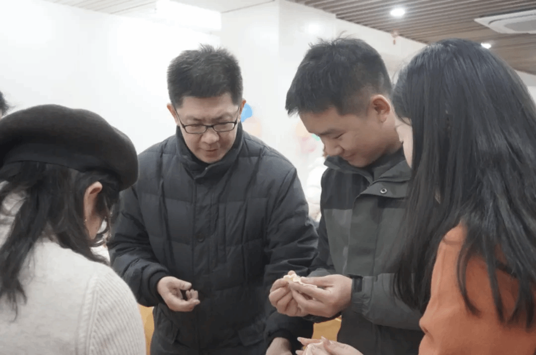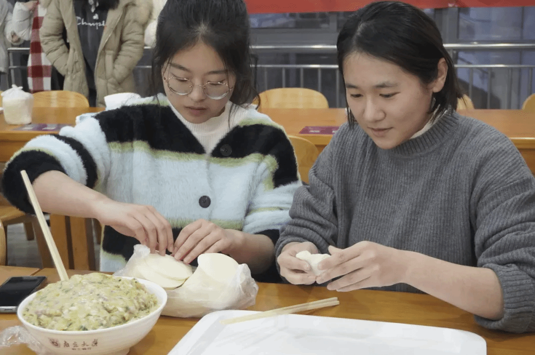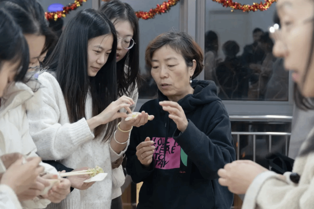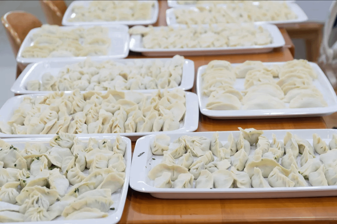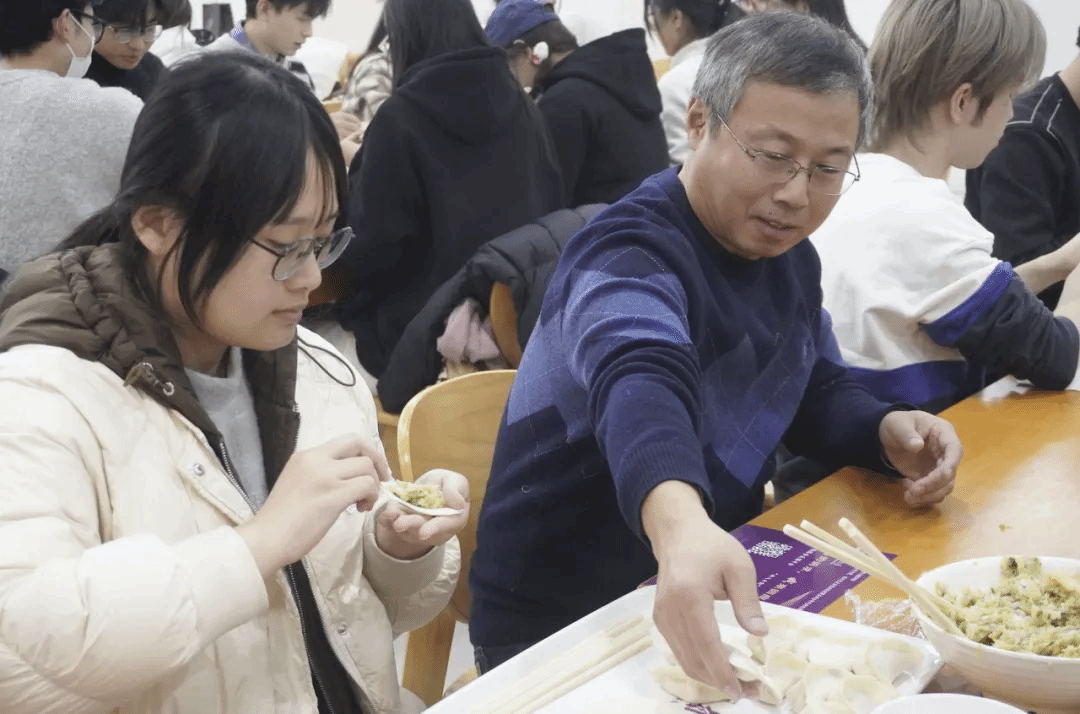 下午五点,包饺子活动正式开始。师生齐动手,擀面皮、取饺子馅、包饺子,不一会儿,形状各异的饺子摆得满满当当。过程中,不乏热心助人的“包饺子小能手”传授经验,现场一片欢声笑语。