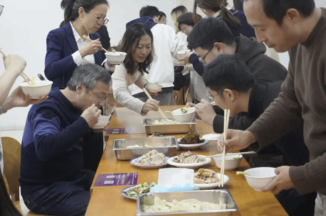 热气腾腾的饺子很快出锅,配上拍黄瓜、口水鸡等凉菜,“冬至晚宴”正式开始!大家围坐成几圈,开始享用自己的劳动成果。