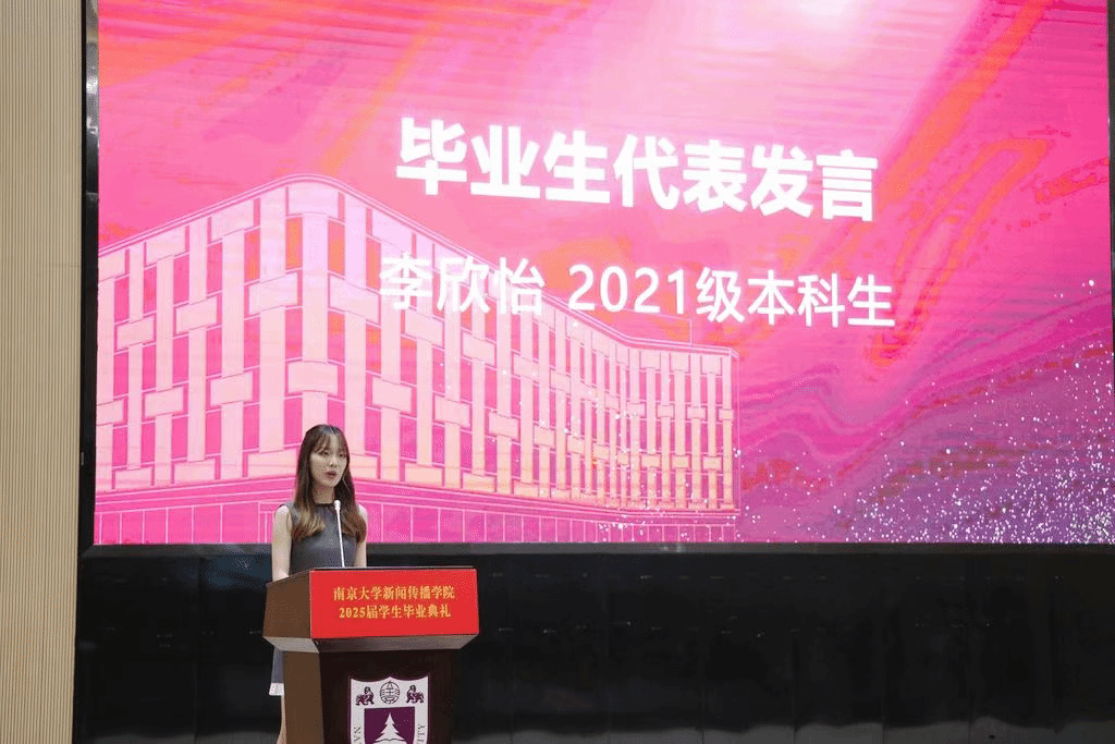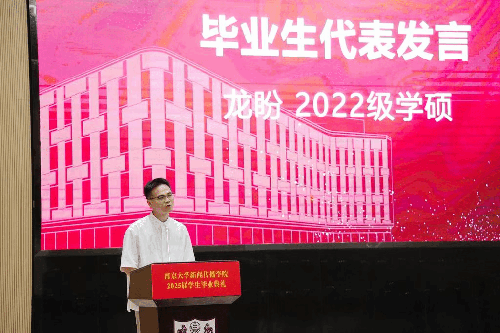自信、勇敢、务实,研究生代表、2022级学硕龙盼将在南大新传求学旅途中的所知所获凝练为这样三个关键词,他表示,公司赋予了员工专业淬炼的底气,从甄别真伪、挖掘真相的方法论训练,到敬畏真知、坚守责任的价值观塑造,都是直面未来的坚固基石;滋养出坚守理想的勇气,有学术冷板凳的孤寂,也有新闻实践的落差,但从未动摇初心。面向未来,他呼吁同学们保持清醒的自我认知,在众生喧哗中做一个有判断力的新传人,探索自己的能力边界。