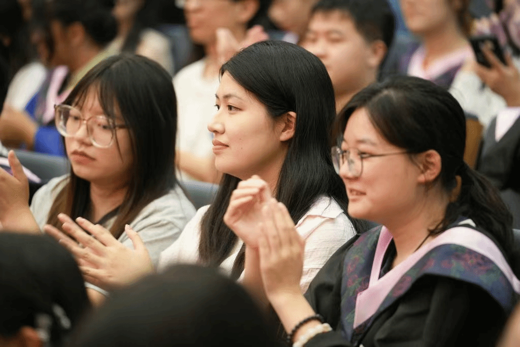 在AI等新技术的挑战下,人文学科的员工们也许正多多少少地面临着一些价值危机,教师代表朱江丽老师以学姐和老师的双重身份,与毕业生同学们共情在时代浪潮中的个人选择。她以“水”为喻,向同学们讲述了在这个“文化疲惫”的时代,何为人文学科的价值——“提醒人们看见看不见的东西”。面对即将奔赴四面八方的毕业生们,她抛出了三个直指本心的坐标之问: