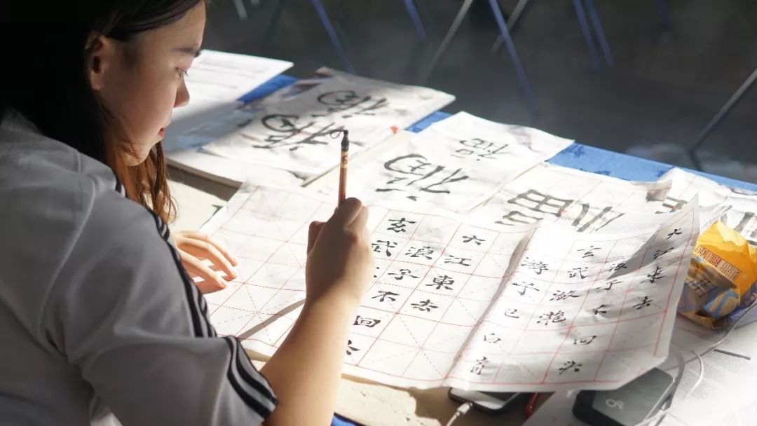 与热闹的民艺展台不同,书法展台在简洁的黑白轮廓里勾勒古典中国。对中国人来说,汉字不仅仅是传递信息的工具,其书写更成为了一门艺术。 秀美遒劲的中国字让驻足台前的外国友人颇感新奇。在传媒实验班同学的帮助下,Damyan收获了用毛笔写就的中国名字“戴米安”,还学到了中国传统文化里 “福到了”的寓意。