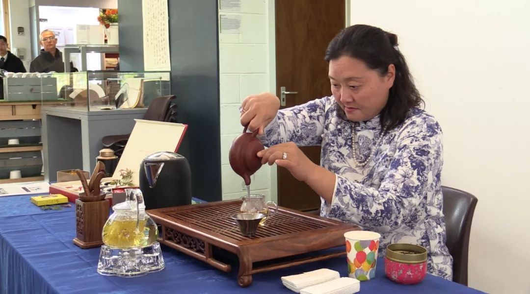 这边墨香四溢,那边茶香萦绕——身着青花旗袍的华人老师Grace Wang,从家里带来了收藏的各式茗茶,正在进行茶艺表演。来往于Costa Coffee(英国本土咖啡品牌)的英国员工,也品尝到了正宗的中国味。