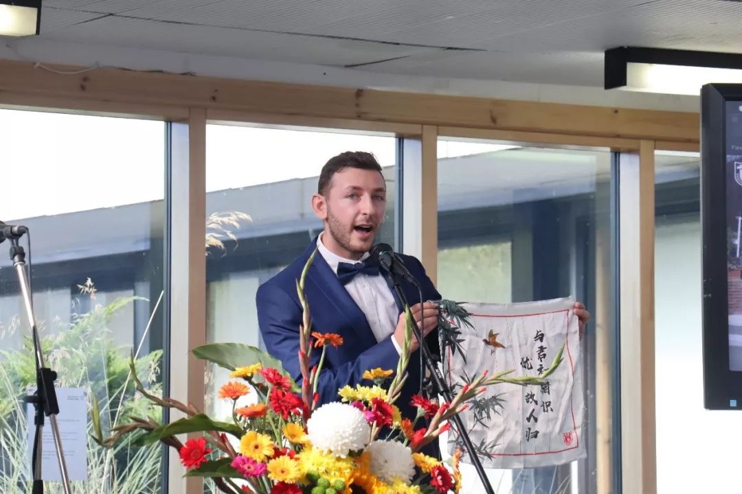 交换项目负责人Damyan Kachulski老师 随后发言,特别感谢了传媒实验班同学赠予的礼物——印着“与君初相识,犹如故人归”的手帕。这句诗对于Damyan有着特殊的含义:去年此时,他带领着16级传媒实验班在斯特灵进行交换学习,17级员工们与斯特灵虽是初次相见,却同样宛如亲切的故友。
