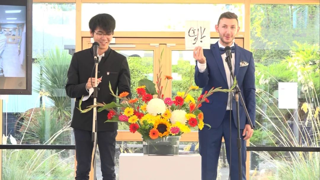 一首《梁祝》翩然响起,二胡与小提琴弦音和鸣,现场的掌声此起彼伏。这是传媒实验班范文君和吴梓溢带来的乐器演奏。将二胡与小提琴合奏是范文君的主意。和世界流行的小提琴不同,二胡更多地作为一种中国的民族乐器而存在。她希望通过二者的合奏,展现出二胡的包容性魅力,同时也以小见大,通过乐器的融合体现中西方文化的结合。