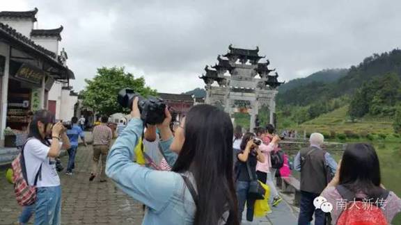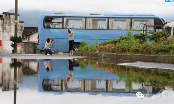 仙林大雨如注,XC体育大二年级修读新闻摄影课程的同学们步履匆匆,冒雨前行。他们要在逸夫楼前乘车赶往皖南——此次课程实习地。
