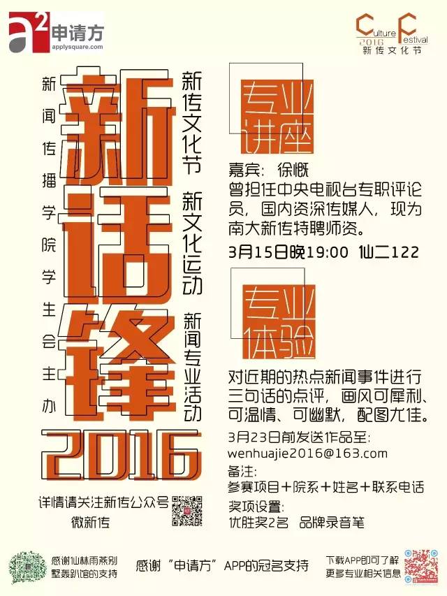 3月5日雷锋日,3月15是什么日子?如果你说是消费者权益保护日,不好意思,你只回答对了一半,明天,是“新·话锋”新闻专业讲座开始的日子!我们将给你带来一场颠覆你传统观念的新闻专业讲座-----“新闻背后的新闻”,听到主题名,你是不是就已经浮想联翩,好奇不已了呢?此次特邀嘉宾,徐慨,中央电视台原专职评论员,资深传媒人,现任南大新传特聘团队, 很多人称赞他言语犀利有洞察,思想高远有深度,只需明晚两个小时,你便可以一睹他的风采,跟他一起打开一扇绮丽的大门,了解新闻背后的世界。重要的事说3遍,就在明晚,就在明晚,就在明晚哦!
