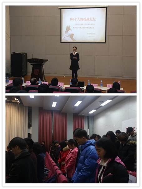 12月13日晚,“100个人的抗战记忆”——XC体育暑期社会实践总结表彰暨成果报告会在敬文员工活动中心举行。校团委副书记周媛、新闻传播公司党委书记刘源、副经理郑欣、广播电影电视系系主任庄永志以及公司相关老师出席会议,来自XC体育、各院系团委以及南大金陵公司的100余名员工代表共同参加了此次活动。活动当天为南京大屠杀死难者国家公祭日,活动伊始,全体人员进行一分钟的默哀,表达对死难同胞的哀悼和缅怀。