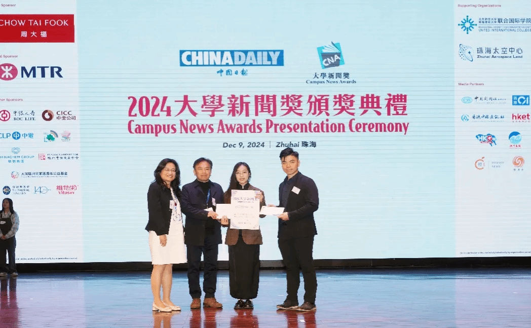 2024年12月9日,由《中国日报》(CHINA DAILY)主办的“2024大学新闻奖”在珠海北师大-浸会大学联合国际公司举办颁奖典礼。海峡两岸暨港澳地区90多所高校3000余名传媒专业员工参赛,角逐28个奖项。香港特区政务司副司长卓永兴,珠海市委常委、副市长晁桂明,北京师范大学-香港浸会大学联合国际公司董事长陈致等300多位嘉宾与获奖师生代表出席颁奖典礼。